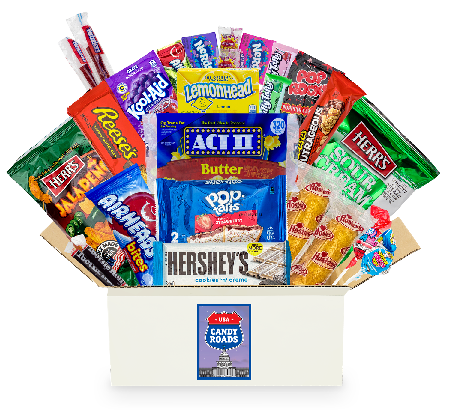 Die Candy Roads Box nimmt dich mit auf eine Reise quer durch die Bundesstaaten der USA. Zu den über 20 möglichen Süßigkeiten und Snacks gehören z.B. Twinkies, Nerds, Herr's Chips, Twizzlers oder die berühmte Hershey's Schokolade.