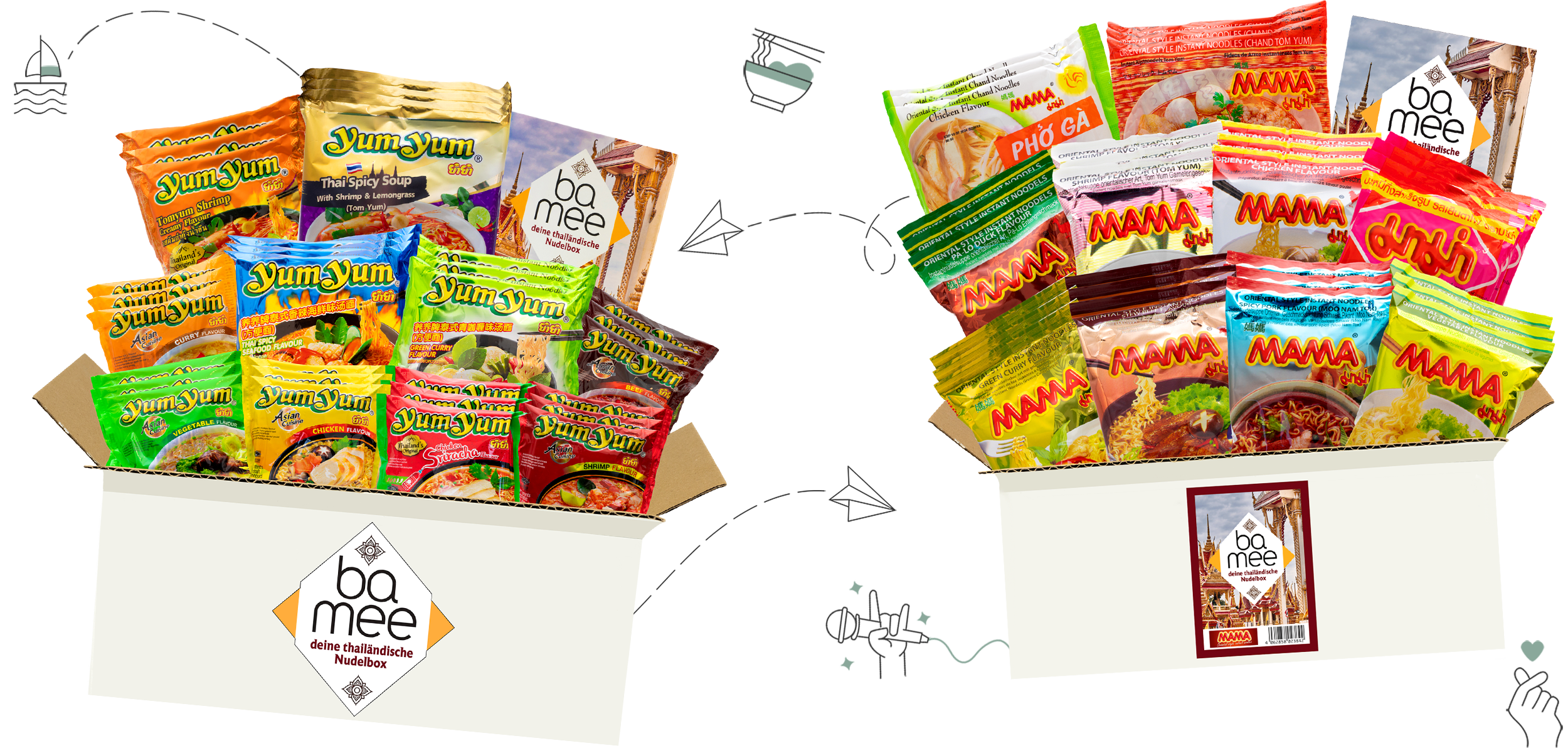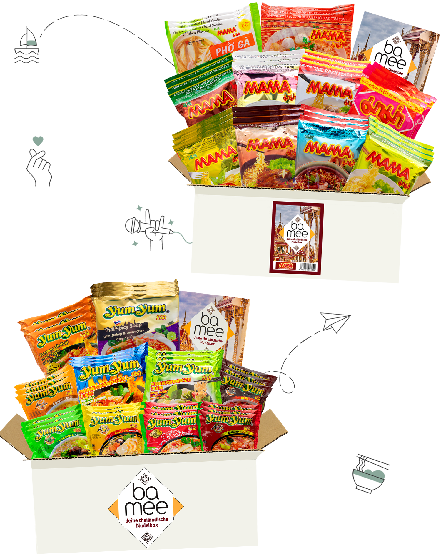 We love Asian noodle dishes more than anything! They are a great way to get to know the different cultures of Asia from Germany. That's why we decided to put together two boxes with lots of delicious instant noodles from the Thai brands MAMA and YUMYUM.
