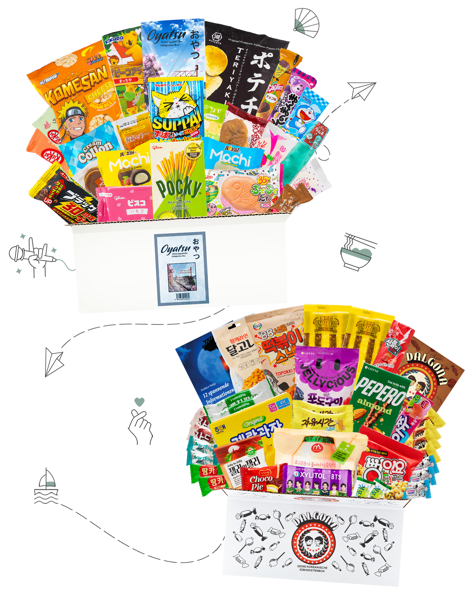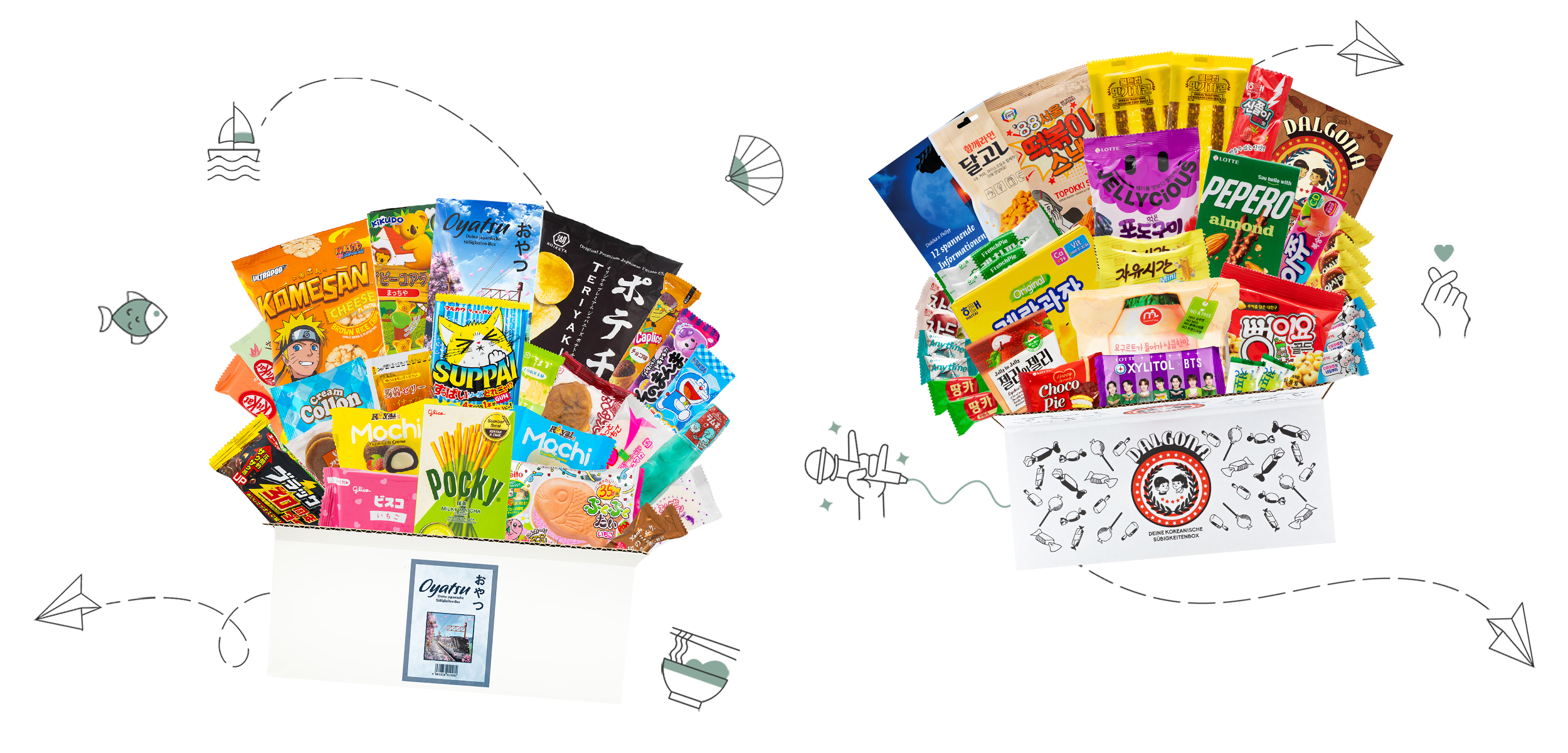 Experience the taste of Asia with selected sweets from Korea and Japan! You get the Dalgona Box with delicious Korean sweets and the Oyatsu Box with special snacks from Japan.