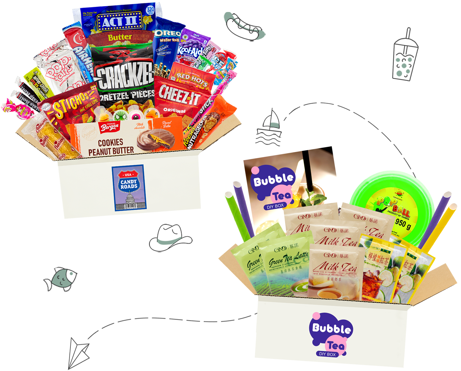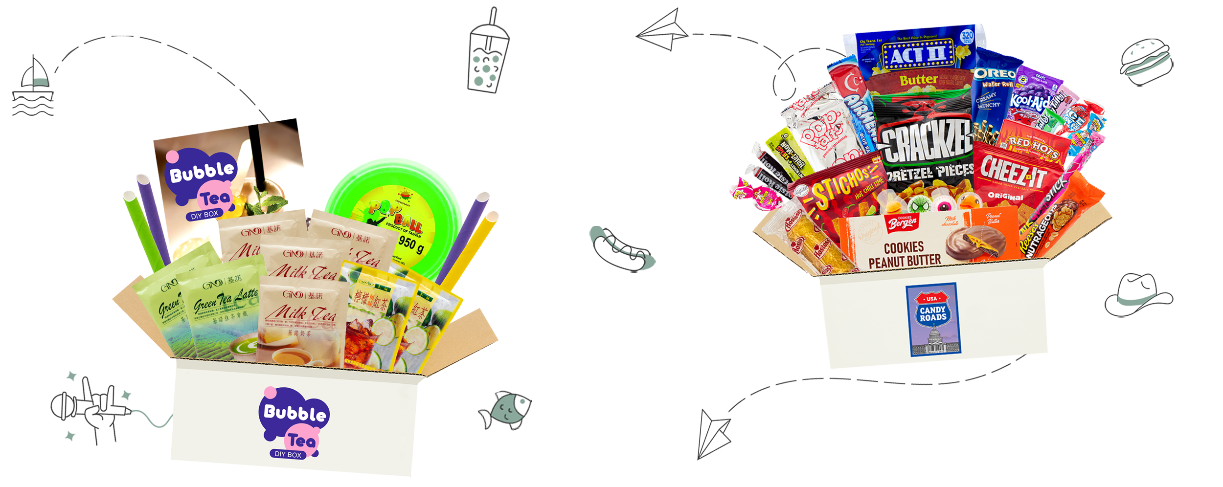 In total, you can look forward to over 70 international sweets, over 50 Asian instant noodles and ingredients for 8 delicious boba teas ! The contents of the surprise boxes are randomly selected.